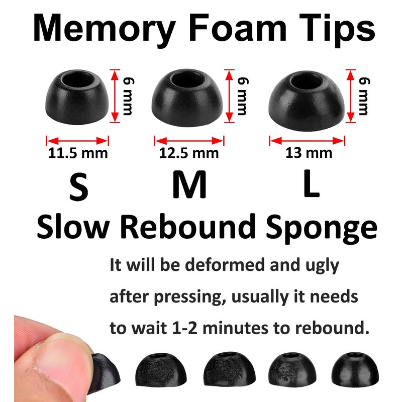 - [Memory Foam Ear Tips ] S/M/L 3 size, Slower Rebound Sponge, Long Lasting Comfort, Made of real memory foam with slower rebound sponge. It will be ugly and deformed after pressing, usually it needs to wait 1-2 minutes to fully rebound. Don’t worry.