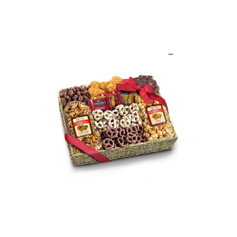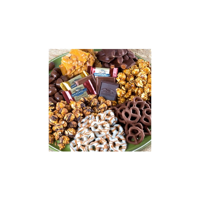 - A gift large enough for the whole office and entire family. Added to the caramel corns and Ghirardelli's finest are heaping handfuls of chocolate-covered sea salt Cashews, chocolate-covered pretzels, caramel drizzled pretzels, peanut brittle, and scrumptious handmade chocolate Almond bark.