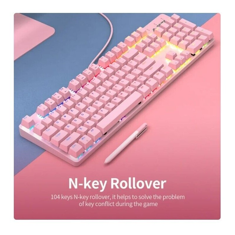 Full-size 104 keys keyboard, equipped with conventional keyboard, numeric keyboard and directional keys, compact layout. N-key rollover, it helps to solve the problem of key conflict during the game.