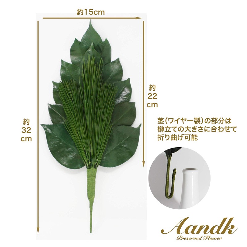 • Materials: Camellia leaf (from Tamba), Miyakomatsu, Wire, Preserved Tape