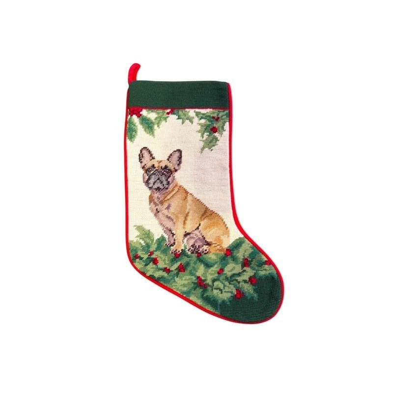A Pets World Needlepoint Christmas Stocking, Tan French Bulldog Design