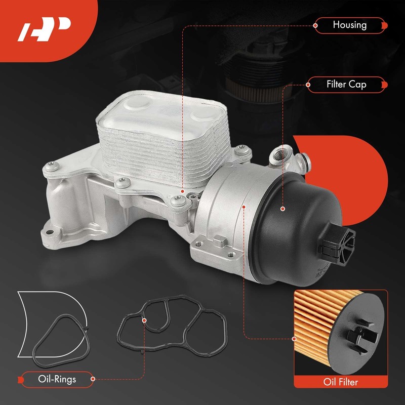 - [Package Details]: ①1 x Engine Oil Filter Housing; ② 1 x Oil Filter; ③ 1 x Resistance Temperature Sensor ④ 1 x Manifold Gasket; ⑤ 1 x O-Ring
