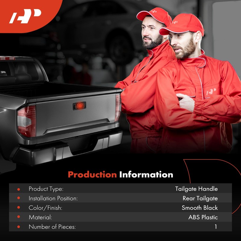 - [Specifications]: ① Package Included: 1x Tailgate Handle; ② Color / Finish: Smooth Black; ③ Material: Plastic; ④ Key Lock Hole: No; ⑤ Camera Hole: No; ⑥ Paintable: Yes