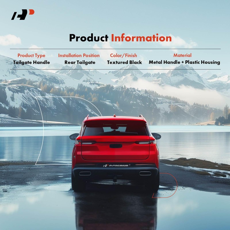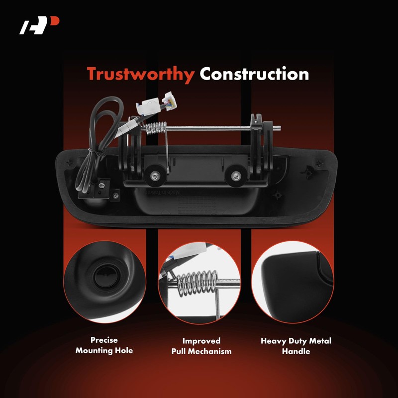 - [Specifications]: ① Package Included: 1x Tailgate Handle; ② Color / Finish: Black; ③ Material: Plastic Housing & Upgraded Metal Handle; ④ Key Lock Hole: No; ⑤ Camera Hole: Yes; ⑥ Paintable: Yes