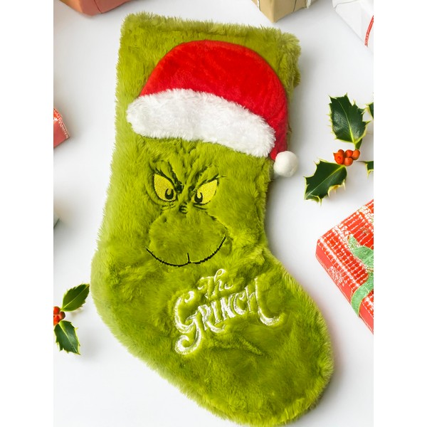- Covered in soft, furry material, this bright green stocking features the iconic Grinch itself, complete with a classic red Christmas hat. With its famous mischievous expression, the Grinch adds a playful touch to your holiday traditions.