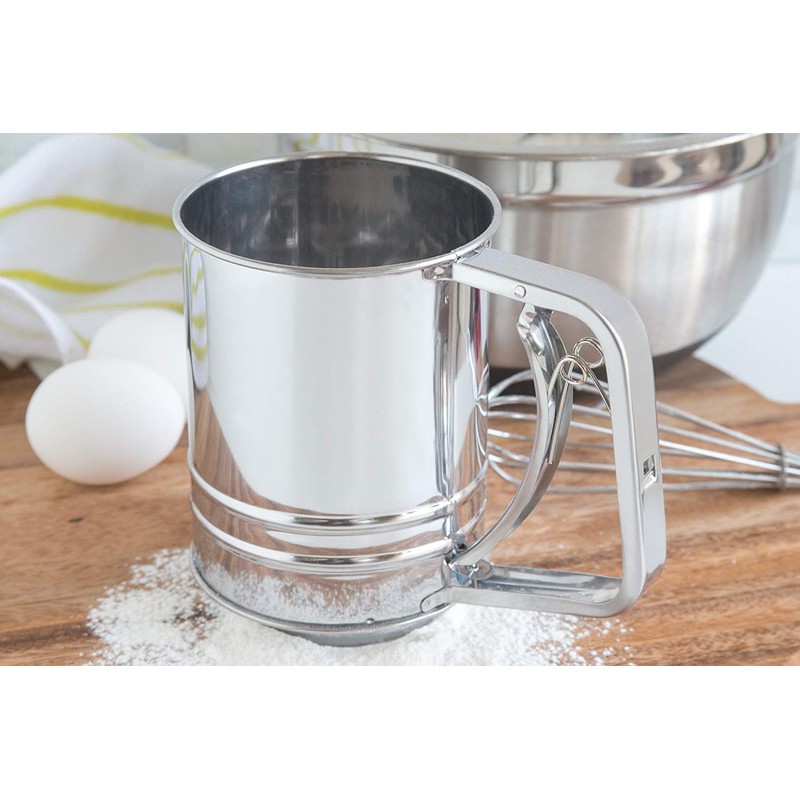 Breaks up any lumps in flour and aerates at the same time to give you lighter, more consistent, clump-free results Make mixing flour into other ingredients easier by sifting with this 3-Cup Flour Sifter! This classically styled, crank-handled sifter has been a favorite of bakers for decades. It quickly breaks up any lumps in the flour and aerates it at the same time to give you lighter, more consistent, clump-free results. Made of durable stainless steel, the sifter features a fine mesh screen. Easy to use: simply turn the crank handle to deploy the sifter inside. A must-have for making genoise, angel food cake, or sponge!