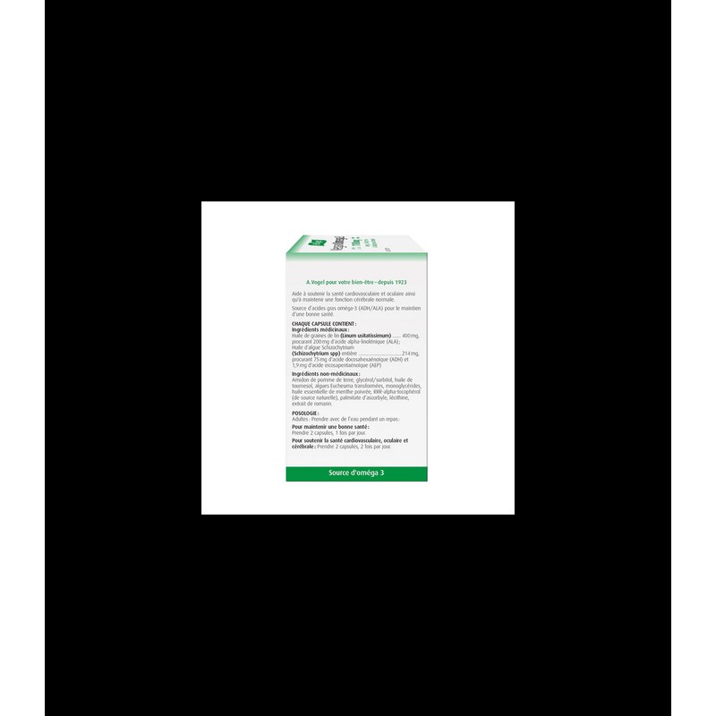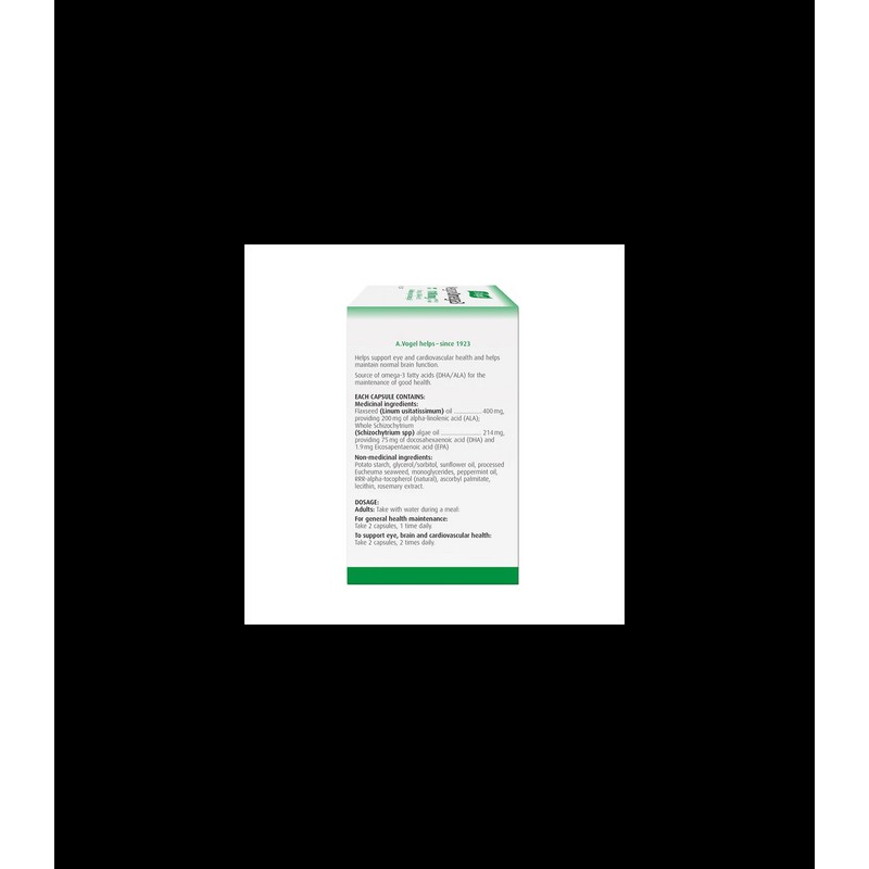 Medicinal ingredients: Flaxseed (Linum usitatissimum) oil ... 400 mg, providing 200 mg of alpha-linolenic acid (ALA); Whole Schizochytrium (Schizochytrium spp) algae oil ... 214 mg, providing 75 mg of docosahexaenoic acid (DHA) and 1.9 mg Eicosapentaenoic acid (EPA)