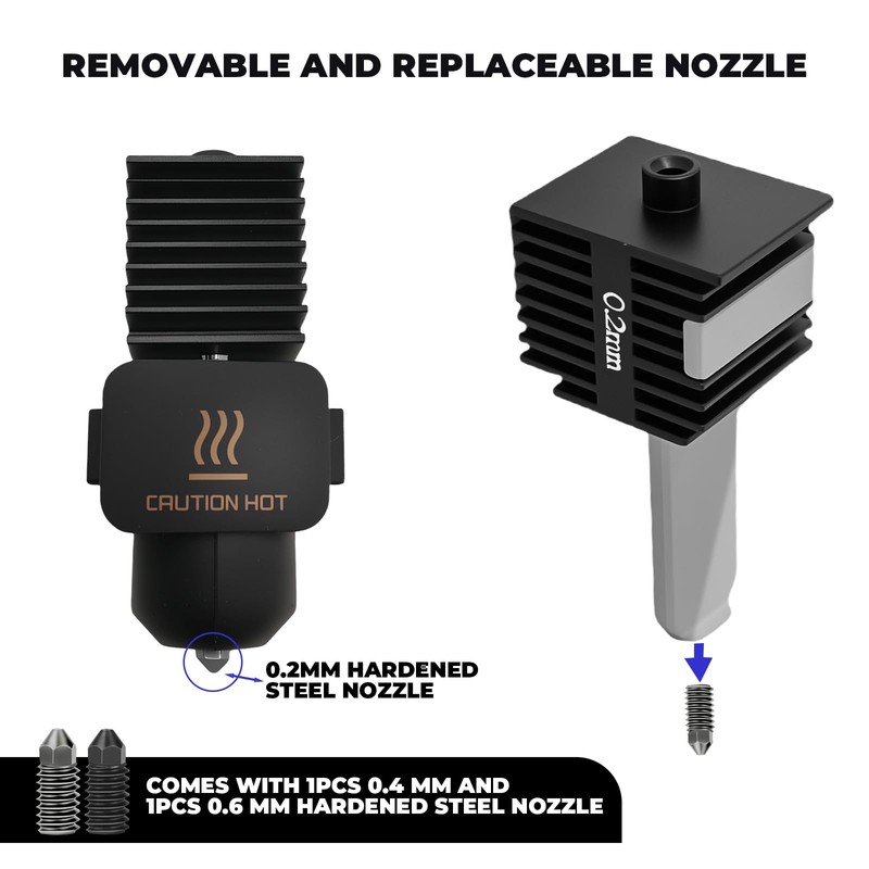 - REPLACEABLE TEMPERED STEEL NOZZLE Hardened steel nozzle features an upgraded removable tempered steel nozzle, allowing you to choose the appropriate nozzle size according to your printing requirements to meet different printing requirements