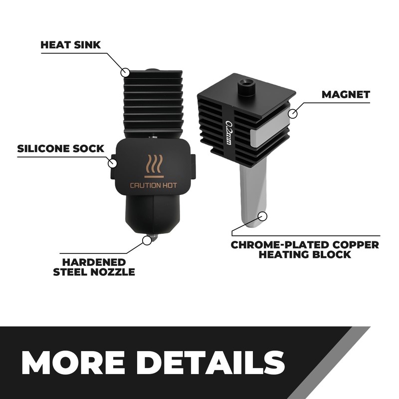 - Wide compatibility: this heating block kit with 0.2 mm has a chrome-plated copper heating block and a hardened steel nozzle that can withstand high temperatures of 500 °C and are compatible with PLA/ABS/PETG/TPU/wood filaments