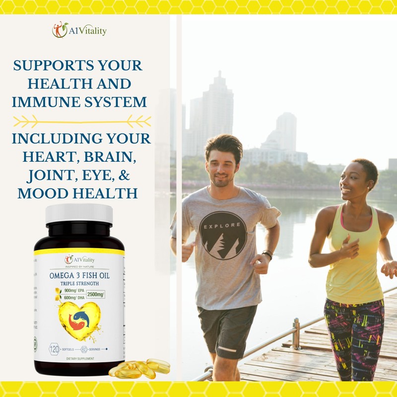 A1Vitality Omega 3 Triple Strength EPA DHA Supplement - 2500mg Lemon Flavored Burpless Fish Oil - High Potency 900mg EPA 600mg DHA Supports Circulation, Brain, Heart, Eye, Skin, Bone & Joints - 120 Softgels