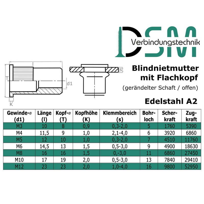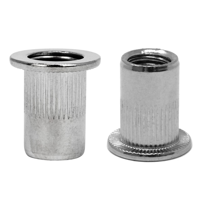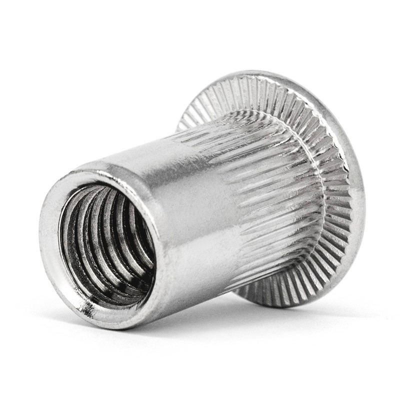 - Flat head rivet nuts with metric internal thread as well as a ribbed and open round shaft with underhead teeth for additional rotation safety