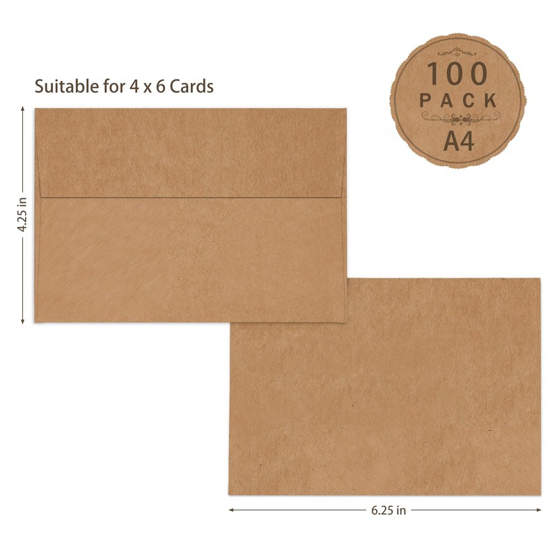 - Premium A4 Kraft Envelopes: Made from recyclable brown kraft paper, these card envelopes measure 4.25 x 6.25 inches, 120 GSM, with enough space for 4 x 6 cards, photos, invitations or RSVP, 100 packs in each box; The plain brown envelopes with a matte texture are elegant and classic, reflecting good taste