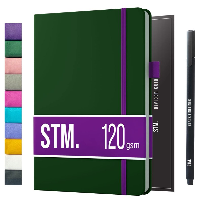 A5 Bullet Dotted Journal Notebook by STM | Thick Bleedproof 120gsm Paper, 215 Pages | Lay Flat Vegan Leather Hardcover | 2 Bookmarks, Printed Page numbers | Black Pen | 5.75 x 8.5 in | Bottle Green