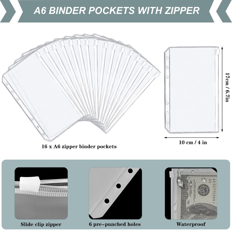 - 6 HOLE BINDER POCKETS - A6 loose leaf pocket adopt PVC material, waterproof and anti-tear, can protect your cash, bills, invoices, etc. A6 binder pockets with zipper can prevent the contents from falling. 26 categories letter sticker label can mark and classify A6 budget envelopes to help you find what you want quickly.