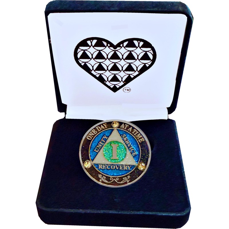 AA 1-Year Crystal & Blue Glitter Sobriety Coin – Black Velvet Gift Box with Heart AA Symbol – Elegant Anniversary Token – Unisex Recovery Gift