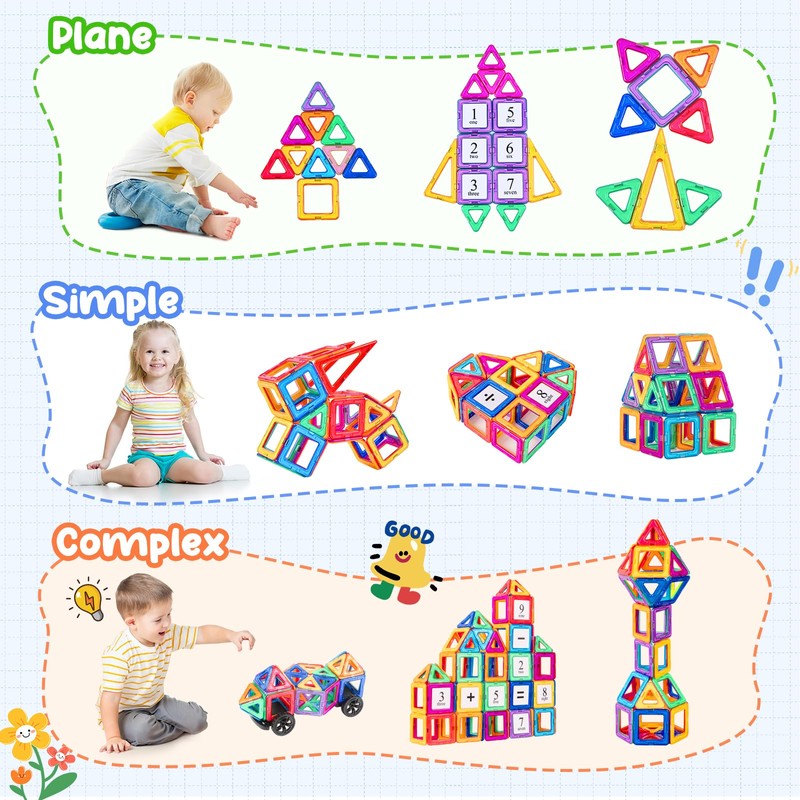 - Idea Gift for Kids:Magnet building blocks are suitable for any festivals and occasions, like birthdays, Christmas, Preschool, Day Care Centers, and so on. Help kids master construction skills, color recognition, sorting skills, stacking skills. The magnetic building blocks is a perfect magnets toys gift for 3 4 5 6 7 8 years old boys girls. (Recommend 3+ Years ages to use.)