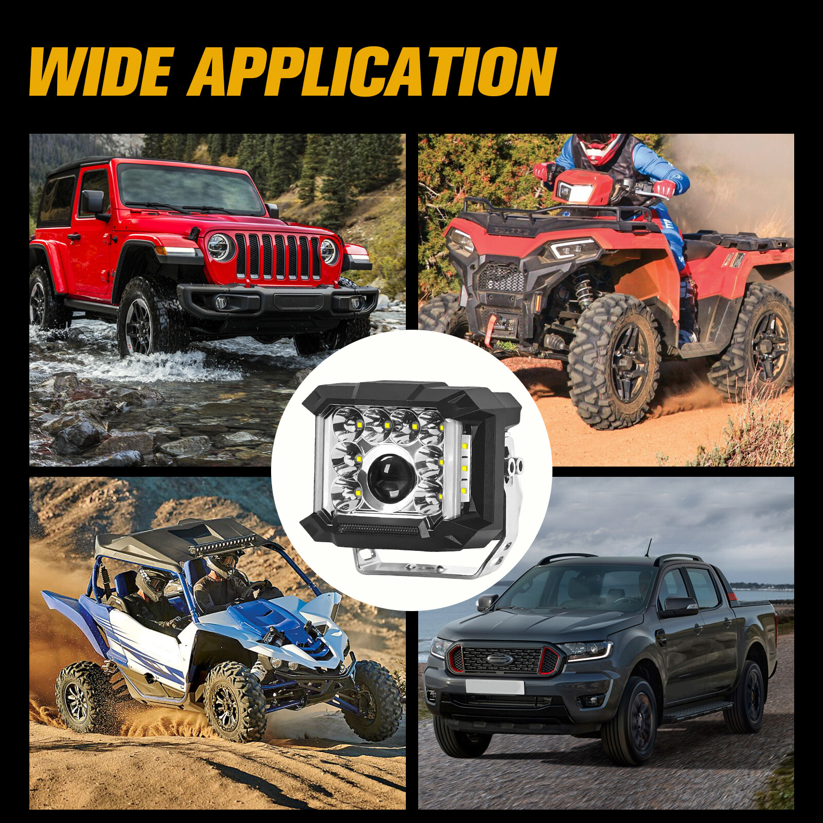 Our specially designed large lens, combined with 8 deep reflection cups and double-sided spotlights, provides an additional wide 270 ° floodlight mode for off-road enthusiasts to achieve deep illumination. This 5-inch LED spotlight's focused lighting is perfect for outdoor driving, providing excellent visibility in dark environments.