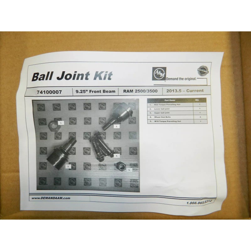 74100007 Dodge Ram 2500/3500 AAM 9.25" Solid Front Axle Ball Joint Kit 2013.5+. KIT CONTENTS: (1) Lower Ball Joint (1) Upper Ball Joint (1) M16 Torque Prevailing Nut (1) Snap Ring (4) Wheel Hub Bolts (1) Ball Joint Seal (1) Torque Prevailing Nut