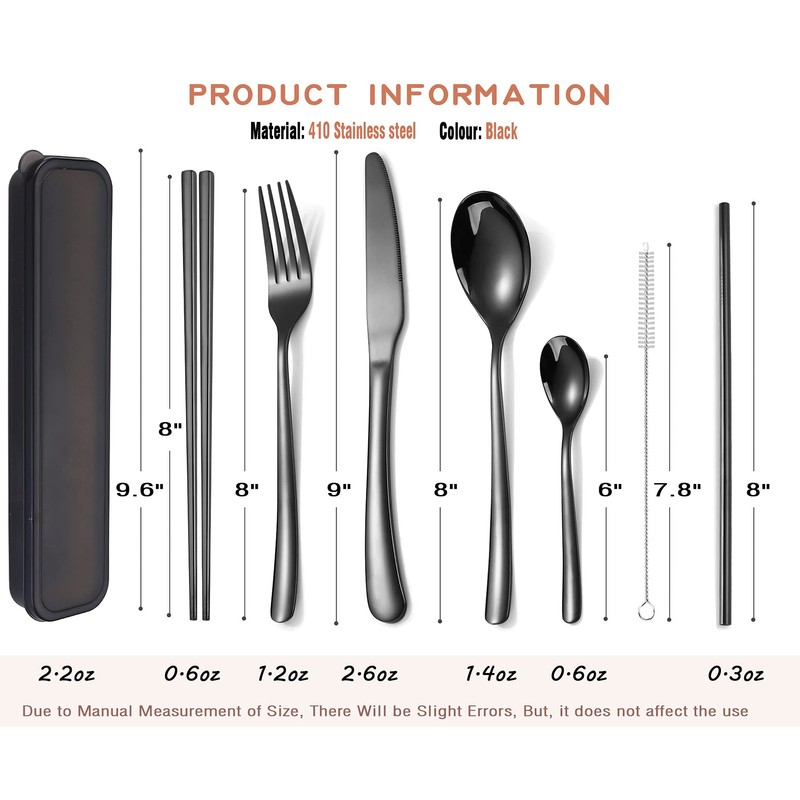 - ✔️Portable Utensils Set: small in size and light in weight,making it easy to carry around. Best choice for 1 person's daily use,and also suitable for daily use, travels, picnics, barbecues, street foods, school office lunches, camping, hiking,home travel, parties or and eating on the go, etc.