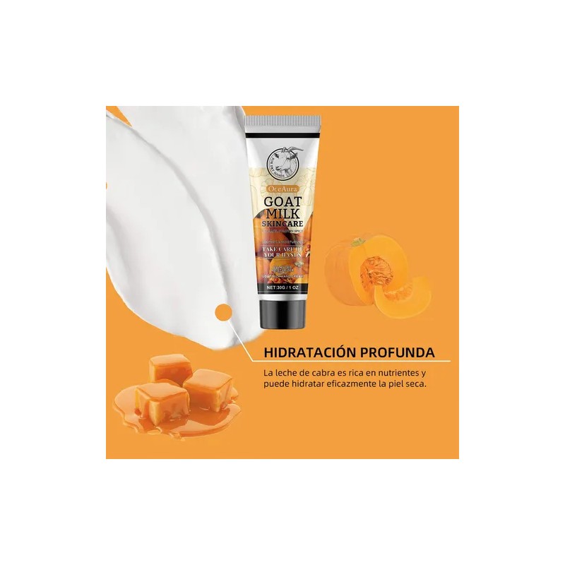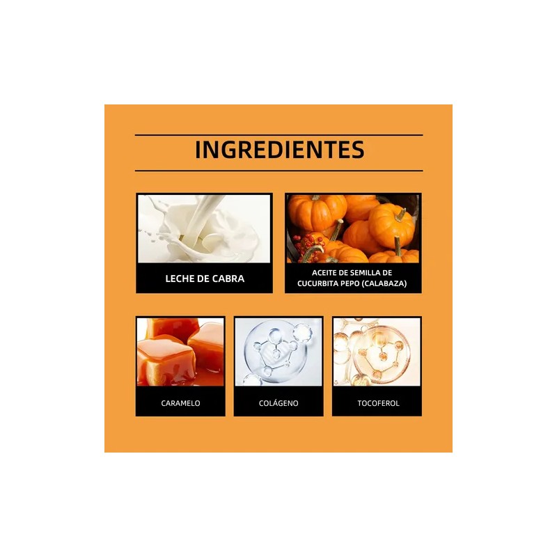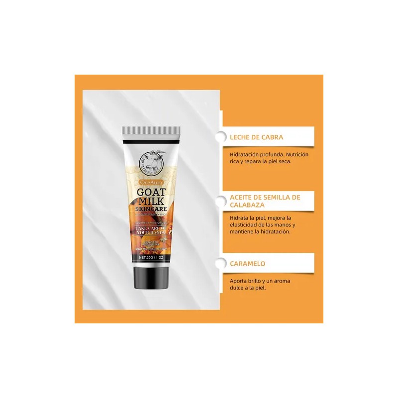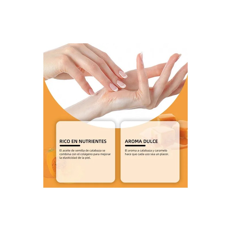 LECHE DE CABRA. Hidrata profundamente, proporciona una rica nutrición y repara la piel seca. ACEITE DE SEMILLAS DE CALABAZA. Hidrata la piel, mejora la elasticidad de las manos y mantiene la humedad. CARAMELO. Da brillo a la piel y un aroma dulce,