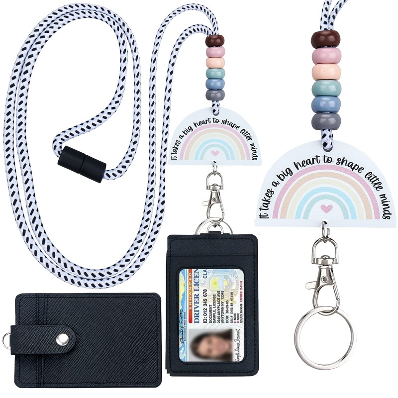 - Teacher lanyard with unique design from the usa, it includes 20'' long soft, smooth, skin-friendly nylon rope, 4 pretty silicon or wooden beads, one big acrylic plate, metal keychain ring, swivel snap hook clip, breakaway safety snap clasp, and a veg leather id holder with 3 card slots. This is the super cute design from california, a functional and stylish id badge lanyard that you will find nowhere else.
