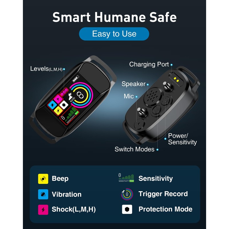 - 6 Customizable Modes for All Dogs: Choose from 3 no-shock options (beep, vibration, beep+vibration) and 3 shock levels (low, medium, high). The advanced progressive design effectively resolves barking issues with over 90% success, catering to different dog personalities.