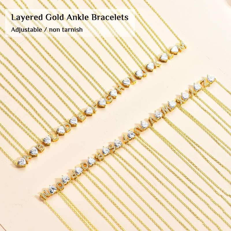 - Gold Initial Anklets: Gold Tennis anklets for women waterproof, Simple and meaningful design, Shining cubic zirconia 26 letters with CZ heart pendant and Tennis chain, Shine, and Luxury. A must-have for summer, beach, surfing, dating, and dressing up
