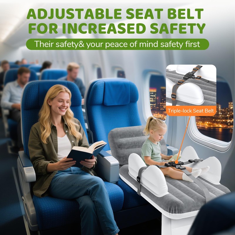- 【Multiple Safety Protections】This toddler airplane travel bed is designed to provide your baby with a comfortable and safe sleeping space during flight.The 3-point harness and raised safety rails prevent your child from rolling out of the bed. Our toddler travel bed for airplane feature reinforced seams and thickened PVC material so the air stays in longer. If you're a parent who regularly flies with your baby, our inflatable toddler travel bed will be an integral part of your trip.