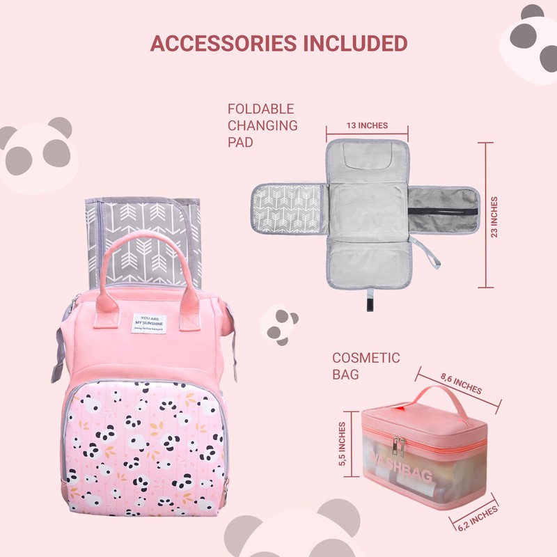- DESIGN FEATURES: Thanks to the versatile design of the Abee Diaper Bag, you can wear it on your back, leaving your hands free to take care of your baby(ies). With its waterproof design you don't have to worry about fluid spills. Stylish pink backpack with childish pattern accents, multiple compartments, and convenient top handles for versatile carrying options.