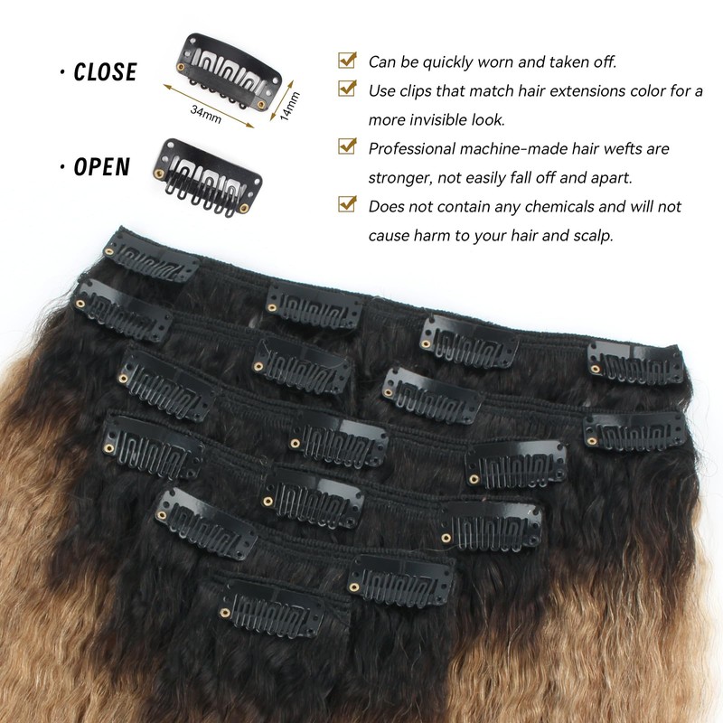 - 【Care Tips】Kinky straight clip in hair extensions can be dyed dark, but cannot be bleached. Since hair extensions don't get their nourishment from the scalp, wash your hair with a moisturizing shampoo and conditioner product, apply conditioner, and let your hair air dry. When styling, make sure the temperature is below 356 degrees F. With proper care, hair extensions can last 3-5 months or longer.