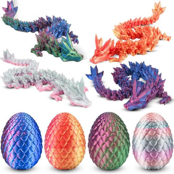 - 3D PRINTED DRAGON IN EGG SET OF 4 : you will get 4pcs x 3d printed eggs, 4pcs x 3d printed dragon in different colors. The height of the 3d dragon egg is 8.5 cm, the width is 6.5 cm, every dragon Easter egg has one 3d printed dragon in it, the dragon measures 21 cm in length. The inspiration for this 3D printing stems from a fictional creature in mythical legend. Great for easter egg hunt !