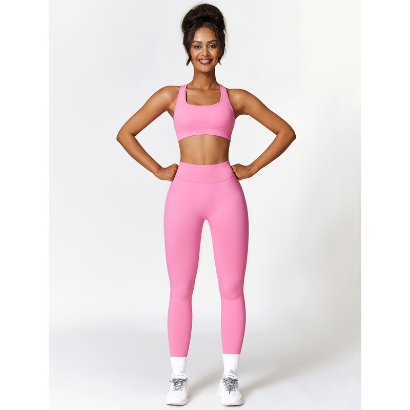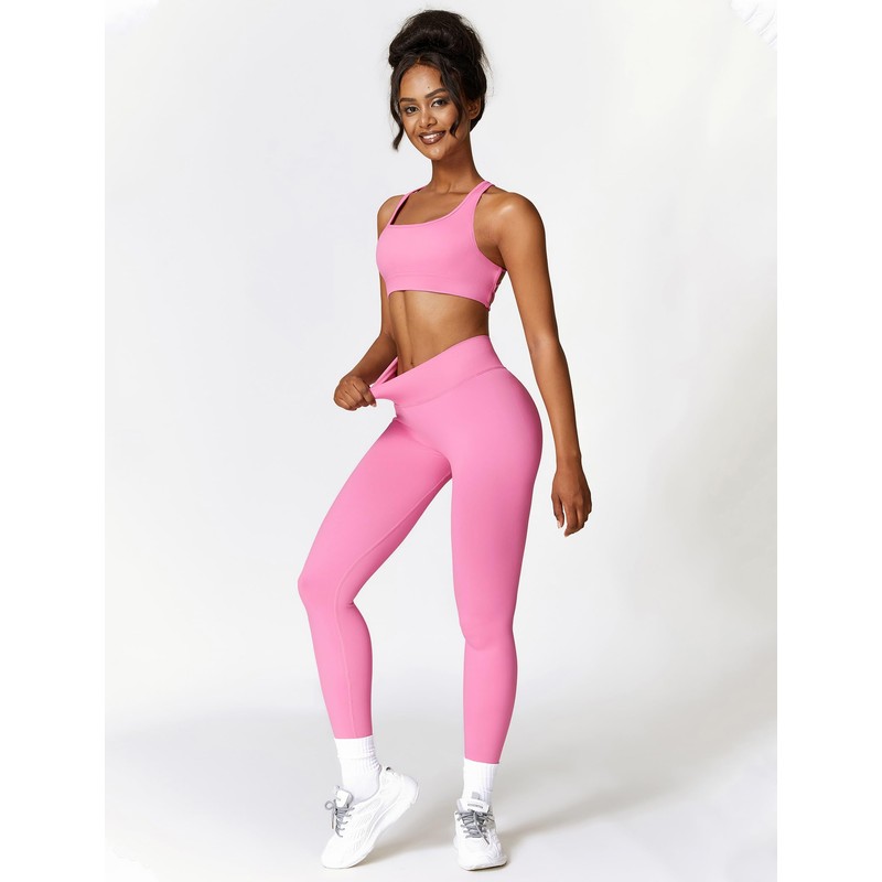 ABOCIW Workout Sets, Seamless V Back Scrunch Lifting Leggings High Waist Yoga Pants Cross Back Strappy Sports Bra 2 Piece Gym Sets Y-Pink Large