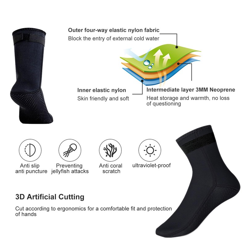 - ✔ [High quality material] High elastic neoprene diving socks are made of 3MM high-quality neoprene rubber and have excellent insulation performance. At the same time, it also has the characteristics of lightweight and quick drying, 360 degree folding, convenient storage, easy carrying, and good breathability.