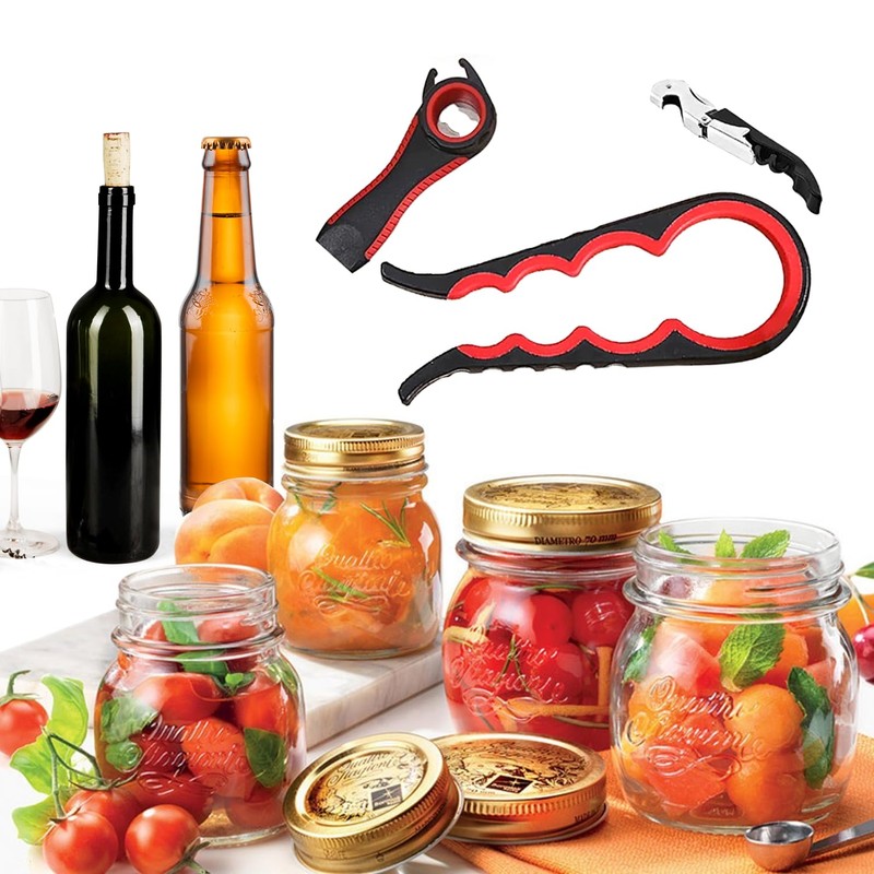 Abridor de Frascos Multifuncional, Incluye Abridor de Tarros 4 en 1, Abridor de Botellas 5 en 1 y Sacacorchos de Camarero. 3 Piezas Abridor de Botellas, con Mango de Silicona Antideslizante