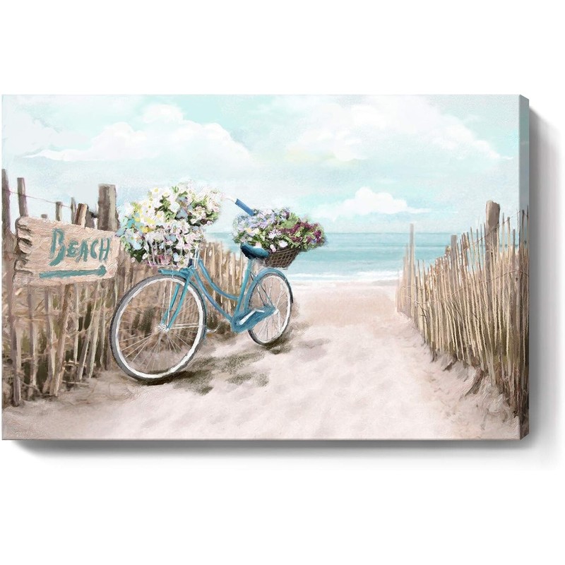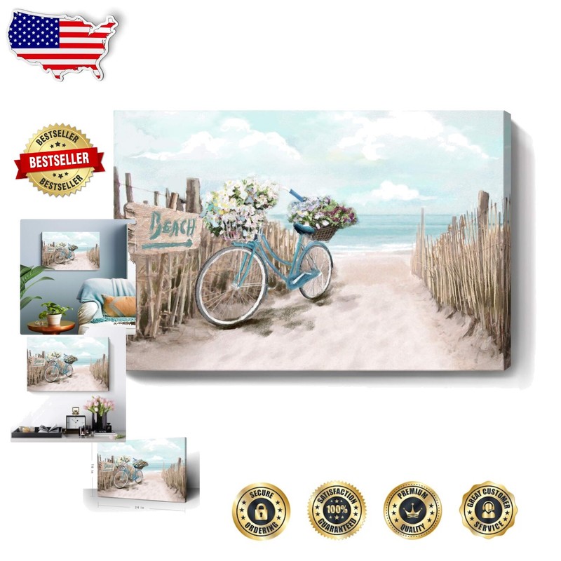 ➤ Calming Seashore Aesthetic in Your Home: Immerse yourself in the serenity of the coast with this exquisite beach picture wall art. It captures the essence of a beach bicycle carrying vibrant flowers, framed by a wood-toned fence against crystal-clear waters, all adorned in tranquil shades of blue and warm natural hues. This enchanting piece is sure to make a stunning statement on your walls.