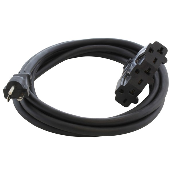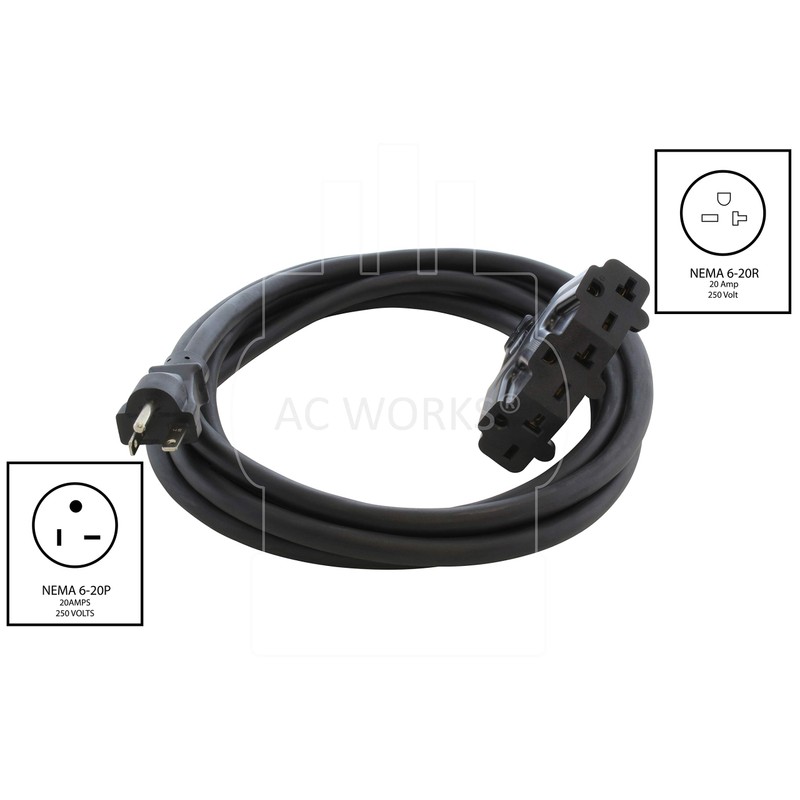 This AC WORKS brand NEMA 6-20 power distributor [S620W620-010] is used as an indoor/outdoor multi-outlet extension cord. The cable has an anti-cold weather jacket that stays flexible in extreme temperatures. It is a NEMA 6-20P straight-blade plug to three NEMA 6-15/20R straight T-blade connectors with a power indicator light. It has a maximum operating power of 5000W. Included with your purchase is a 5-year limited warranty. NEMA 6-20P to NEMA 6-15/20R With Maximum operating power of 5000W NEMA 6-20P, 20 Amp 250 Volt Straight-blade Male Plug (3) NEMA 6-15/20R, 20 Amp 250 Volt T-blade Female Connector With light 10FT SJTW 12/3, 20 Amp Copper wire with anti-cold weather jacket UL, C-UL Listed with 5-year Limited Warranty
