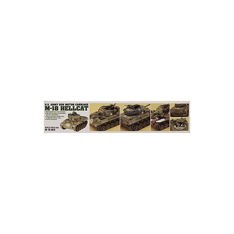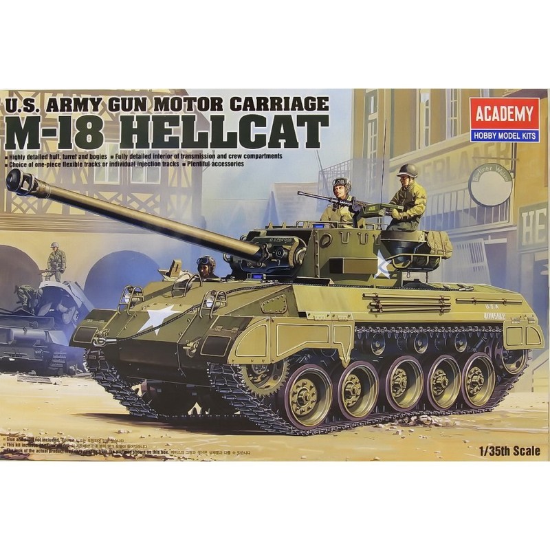 This is a 1/35 scale Academy plastic model kit. The 76 mm Gun Motor Carriage (GMC) M18 was an American tank destroyer of World War II. The manufacturer, Buick, gave it the nickname "Hellcat" and it was the fastest tracked armored fighting vehicle during the war with a top speed up to 60 mph. This kit includes a fully detailed interior of transmission and crew compartments as well as various accessories such as rucksacks and weapons. Decals are included to further enhance the accuracy and realism of this kit.
