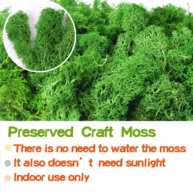 - 【MAINTENANCE NOTES】 --- Our moss for crafts is dried and dyed,please keep it away from water and direct sunlight to prevent fading,not for outdoor use.Green moss is dyed, it will make your hands green during use, you can wear gloves before using moss.