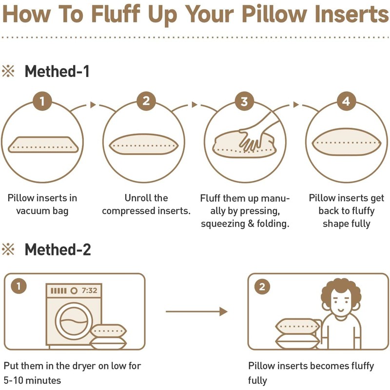 • Machine washable in gentle cycle, tumble dry low. Shipped vacuum packaged and will take up a couple of hours to fully fluff up. Before first use, fluff up your pillow a few times, to get it a full plump look.
