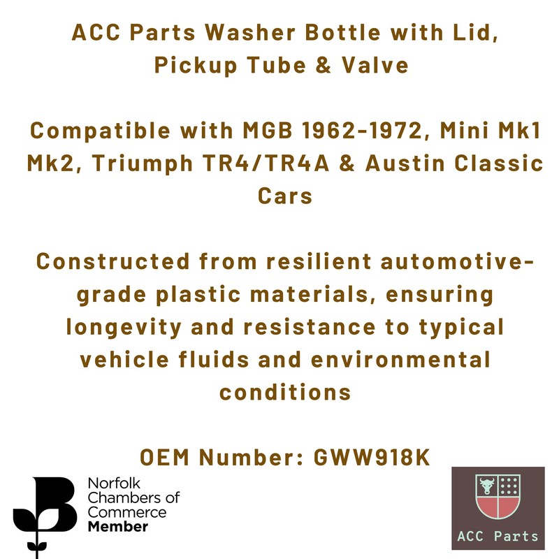 As a UK-based, VAT-registered business, ACC Parts is committed to supplying high-quality classic car components. This GWW918 Washer Bottle is a reliable aftermarket reproduction, designed to meet the specifications of the original parts it replaces (such as the Winguard ADA3833 for Mini). We are a proud member of the Norfolk Chamber of Commerce, dedicated to providing excellent customer support and ensuring correct fitment for your classic vehicle. Compare OEM references and detailed product images for perfect compatibility.