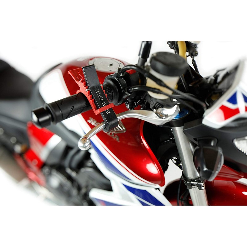 ACEBIKES BRAKEFIX, Handbrems-Arretierung. Der Bremshebelfeststeller aus dem Hause Acebikes ist ein Brakefix zur Arretierung von Handbremshebeln bei Zweirädern aller Art. Das Brakefix wird an Handbremshebel und Lenker montiert. Die Bremse blockiert nun das Vorderrad und Ihr Motorrad steht fest und sicher. Er sorgt zuverlässig für sicheres Parken, sogar bei abschüssigem Gelände. Auch beim Transport oder beim Arbeiten auf der Hebebühne gibt es keine kostspieligen Umfaller mehr. Gesetzlich geschützt. Geeignet für Transporte über kurze Zeiträume ( z.B. Fährüberfahrten ).