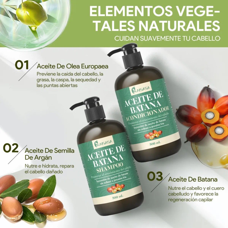 1.Nuestro conjunto de champú y acondicionador, enriquecido con el rico ácido oleico del aceite de Batana, combate el frizz, humecta profundamente y promueve una hidratación duradera para un cabello vibrante y saludable.