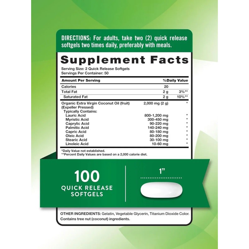 Las Cápsulas de Aceite de Coco de Nature's Truth son un suplemento dietético que ofrece una forma conveniente y pura de incorporar los beneficios del aceite de coco en tu rutina diaria. Cada envase contiene 100 cápsulas blandas, fáciles de tomar y digerir.
