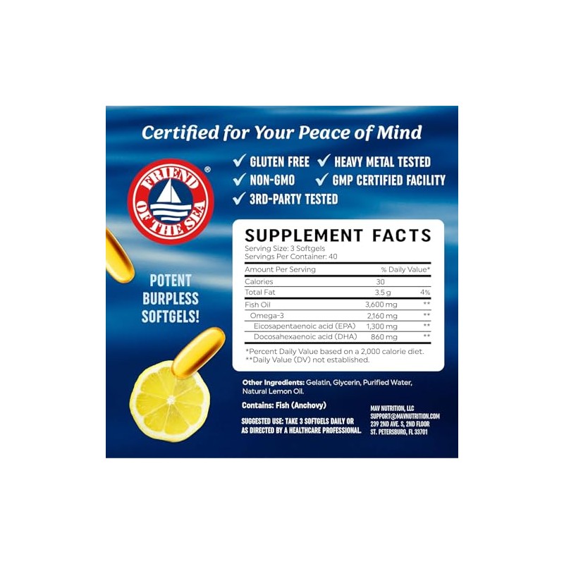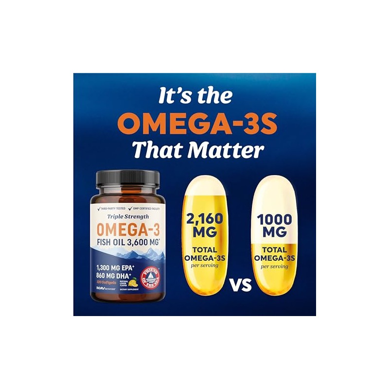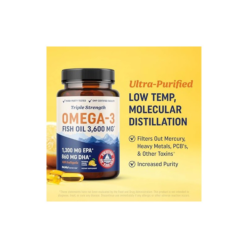 El Fish Oil de triple potencia de MAV Nutrition ofrece una cantidad super concentrada de ácidos grasos esenciales. Cada porción contiene 1296 mg de EPA y 864 mg de DHA. Los ácidos grasos en nuestras cápsulas contribuyen al mantenimiento de articulaciones, ojos y cerebro saludables, además de otros beneficios. Este suplemento proporciona 3,600 mg de aceite de pescado por porción, obtenido exclusivamente de peces silvestres de pesquerías sostenibles certificadas por Friend of the Sea. Nuestro fish oil no transgénico es altamente refinado mediante destilación molecular, un método que mejora la pureza y reduce al mínimo la presencia de mercurio, metales pesados, PCB y otras toxinas. Además, nuestras cápsulas de gel suave están diseñadas para evitar el sabor a pescado y están infusionadas con un refrescante sabor natural a cítricos, haciéndolas fáciles de consumir.