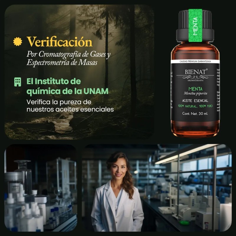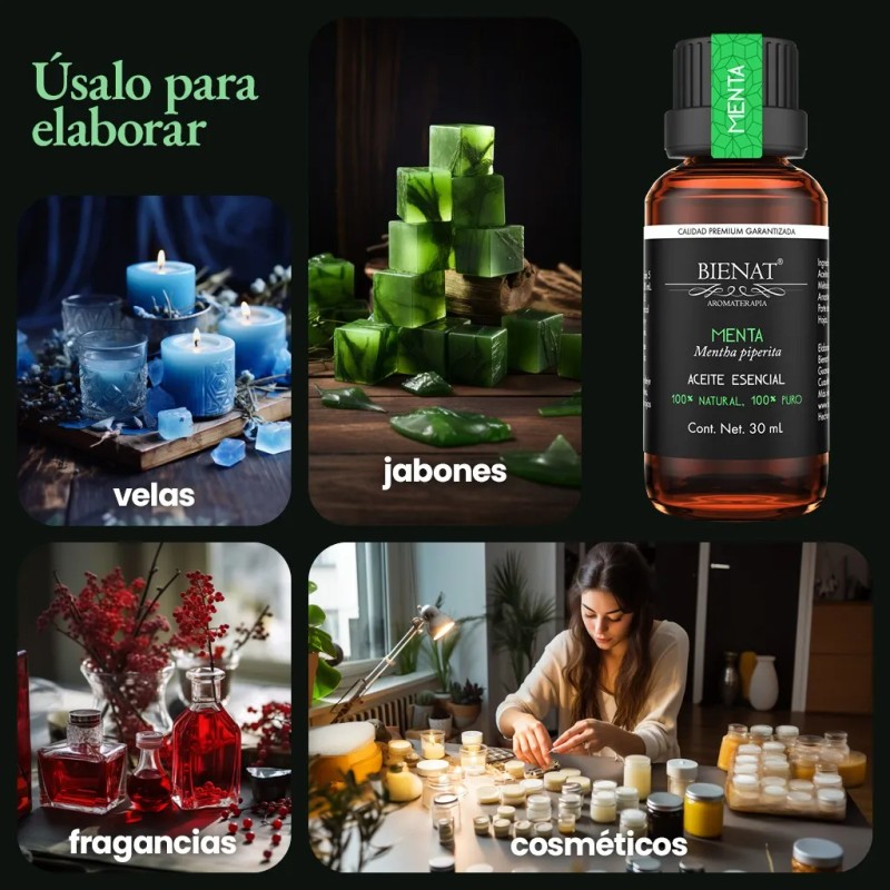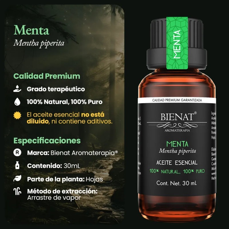 Aceite esencial de menta 100% natural y puro. Refresca, alivia dolores, mejora la concentración y facilita la respiración. Ideal para aromaterapia y uso tópico.