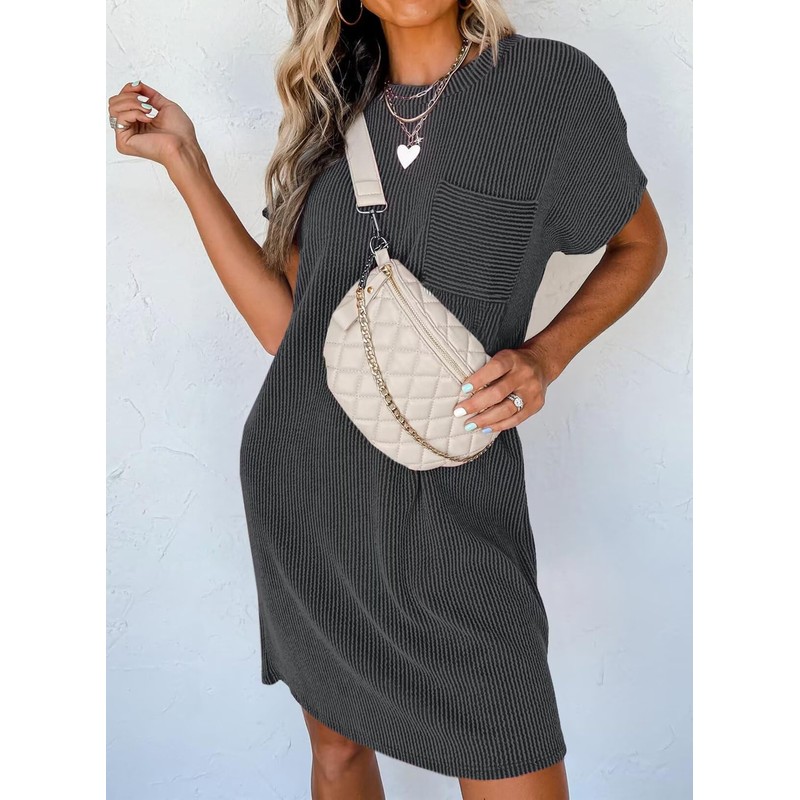 Acelitt Women Casual Summer Dress 2025 Fashion Crewneck Short Sleeve Trendy Loose Vacation Beach Ribbed Tunic Shift Tshirt Mini Dresses Black XL