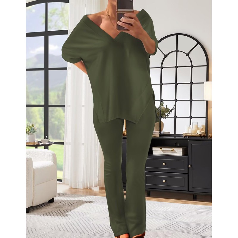 - 【FASHION & COMFY DESIGN】This women's two piece summer outfits for travel vacation resort wear Lounge features a deep v neck , short sleeve t shirts, side split pullover tops, high waist flared long pants, solid color, stretchy pants sets. The oversized top and body-contouring flared pants sets are easy for putting on and taking off, the loose short sleeve slit tops designs are forgiving for anybody, elastic waist flared leggings enhance leg silhouette perfectly.