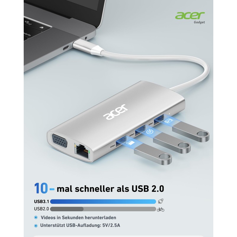 Acer USB C Hub with 4k HDMI, 9-in-1 USB C to Ethernet Adapter, 5Gbps USB-A 3.1 Docking Station, PD 100W Charging, SD Card Reader, USB to VGA Splitter for MacBook, Acer, Laptops, Surface (Silver)