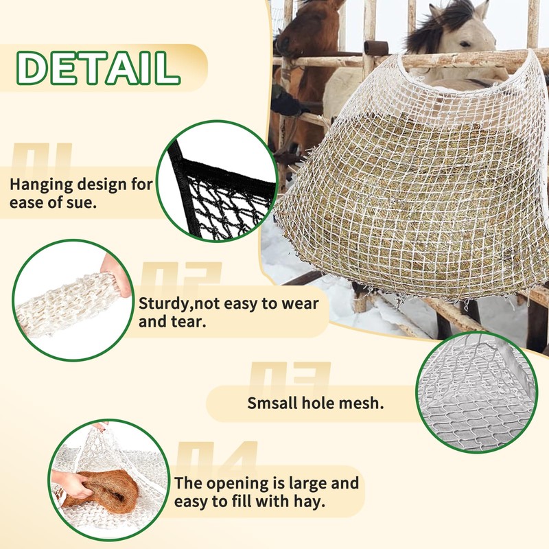 - Slow feed hay net is specially designed for storing hay and feeding horses, which is a good tool for you to use and helps reduce hay loss; At the same time, it can also be applied as a practical gift to family and friends who have horses, goats and other animals
