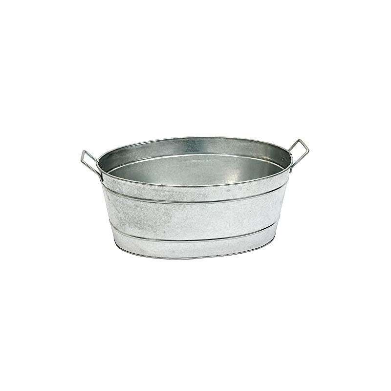 - Made of galvanized steel, for indoor and outdoor use, with two riveted side handles for carrying, Oval Tub measures 24"L including handles x 15"W x 9"H
